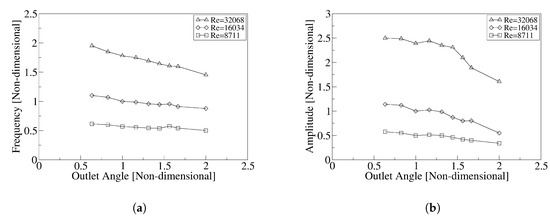Frequency (a) and amplitude (b) of the (FO) outlet dynamic mass flow, as a function of the mixing chamber outlet angle and for three different Reynolds numbers, 8711, 16034 and 32068.