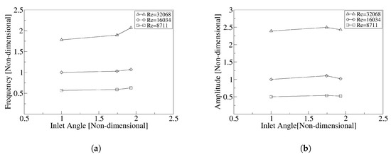 Fluidic oscillator output mass flow Frequency (a) and amplitude (b) as a function of the mixing chamber inlet angle and for three different Reynolds numbers, 8711, 16034 and 32068.
