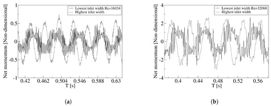 Net momentum acting on the fluidic oscillator inlet jet and for two different mixing chamber inlet widths (the lowest and the highest), two different Reynolds numbers, 16034 Figure (a) and 32068 Figure (b), were considered.