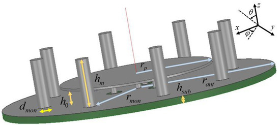 The antenna geometry was parametrically studied by using the full-wave commercial software Ansys HFSS, by acting on its relevant parameters, whose optimized values are summarized for the sake of conciseness in Table 2. It is worth mentioning that the antenna was optimized by means of physical considerations and not by using blind multi-variable optimization algorithms. The dominant physical effects associated to most relevant geometrical parameters on final antenna radiation pattern. For instance, monopole heights were tuned from to to achieve satisfactory gain compensation at high elevation angles. Moreover, patch radius was chosen to set antenna central frequency, according to the general considerations in [22]. Finally, the patch height was also used for tuning purposes.