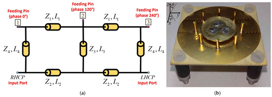 Let us consider a circular metallic patch suspended in air to minimize losses due to the dielectric (Figure 1). It is fed in such a way to radiate a broad beam in the boresight direction () by exciting the fundamental mode, according to the cavity model in [22]. Such a circular patch is sequentially-fed by using three pins rotated of each other [15], in such a way to generate a CP with a considerable AR bandwidth.