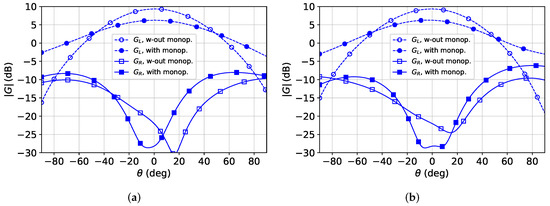 Furthermore, to verify the correctness of the design procedure, a prototype of sequentially-fed circular patch antenna was fabricated for operating over the bandwidth GHz, as shown in Figure 2b. The effect of passive monopoles on the radiated field pattern was investigated by simulating the resulting antenna both in presence and in absence of monopoles, as shown in Figure 3a,b, both in cut planes. As it is apparent, the monopoles have the positive effect of increasing antenna gain for elevation angles far from broadside direction ().