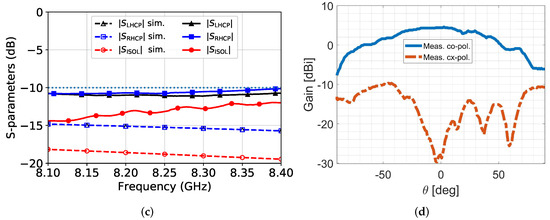 As it can be inferred from Figure 3c, simulated (empty triangular/squared markers, dashed lines) and also measured (filled triangular/squared markers, continuous lines) antenna impedance matching at the two input ports are satisfactory and almost constants ( dB in both cases) in all of the considered band. It has to be noticed that the degradation of measured reflection coefficient with respect to the ideal simulated one (with a commercial circuital software) is mainly due to fabrication tolerances and to the low-cost adopted technology. Moreover, the isolation between input RHCP and LHCP ports ( parameter) was simulated (empty circular markers, dashed line) and measured (filled circular markers, dashed line); they are satisfactory ( dB) and almost constant over all the considered bandwidth GHz.