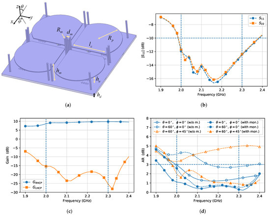 Once we evaluated the radiation performances and the polarization purity of a single sequentially-fed patch antenna loaded by a fence of passive monopoles, the antenna was properly scaled to be used as a building block for the design of a dual-CP 2-by-2 array, operating in the higher UHF band at GHz. In this case, the antenna was loaded at its center and around it by passive monopoles to increase the antenna gain close to end-fire direction. In Figure 4a the array geometry is presented by highlighting the relevant parameters for antenna optimization. To enhance the antenna compactness, the circular patches composing the array were cut in correspondence of array symmetry axes, without significantly affecting the radiation pattern due to the two-folded symmetry preservation. In addition, the presence of four passive monopoles at the antenna center helps to compensate tip/edge effects due to the cuts. The final parameter list used to fabricate the antenna prototype is shown in Table 3.