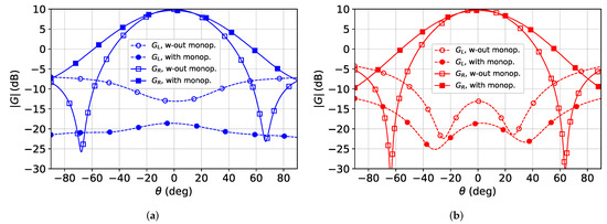 Simulated RHCP () and LHCP () gain patterns versus elevation angle with (filled markers) and without (empty markers) monopoles around the 2-by-2 array, for the cut-planes at (a) and at (b) . The results are provided at the central frequency GHz.
