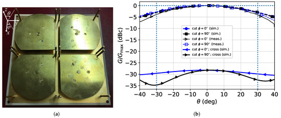 A prototype of the 2-by-2 array operating in the higher UHF band ( GHz) is shown in Figure 6a. The gain of such an antenna is reported in Figure 6b, in which a fair agreement between simulated and measured co-polar gain patterns can be found in the elevation angle range . Moreover, the array presents a very low cross-polar component (<−25 dB), as it can be inferred from the simulated traces with filled triangle markers.