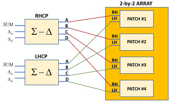 The feeding scheme that guarantees the proper phase shifts between the three pins used to feed array patches (already presented in Figure 2a), and thus CP, was scaled and replicated for each element of the array. Finally, the four RHCP (LHCP) ports were connected to two standard RHCP (LHCP) networks [31] to obtain the RHCP (LHCP) sum and difference patterns required for satellite tracking, as schematically shown in Figure 7. The two feeding networks were realized on a separate board in microstrip technology. On the other hand, the scaled networks used to feed each array element, schematically shown in Figure 2a, are printed on their back. The four feeding networks were fabricated by using a ROGERS TMM4 substrate, with different thickness mm, due to the frequency scaling at GHz.