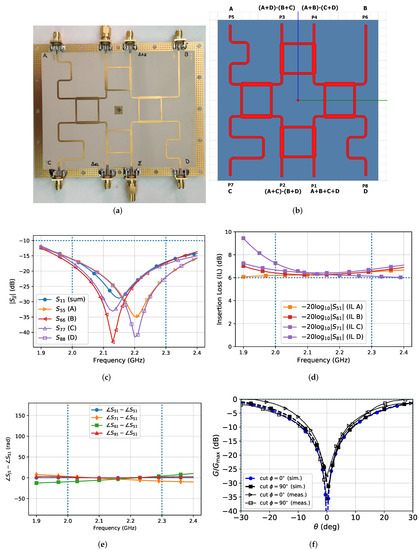 The feeding network was fabricated as shown in Figure 8a, whereas in Figure 8b the circuit layout is presented, in which all network ports are labeled from P1 to P8. According to [31], the network is able to synthesize the sum () and the difference (, ) patterns required for satellite azimuthal and elevation tracking. In particular, the RHCP (LHCP) networks were connected through the ports labeled by A, B, C and D to the four RHCP (LHCP) array input ports. The sum pattern (A+B+C+D signal) is obtained at port P1. The two difference patterns, i.e., and , are instead obtained by synthesizing the signals A+B-C-D and A+C-B-D at ports P4 and P2, respectively. Moreover, In Figure 8c the simulated reflection coefficients at network ports (), which are directly connected to the array RHCP/LHCP ports, are shown. For the sake of simplicity, in Figure 8d the simulated the insertion loss () between network output (A, B, C and D) and input (P1) ports is also presented. As it is apparent, good reflection coefficients and satisfactory insertion loss occur. In Figure 8e the simulated relative phases between network output (A, B, C and D) and input (P1) ports is also provided. Such a result clearly shows that all the output signals of networks, used to feed the 2-by-2 array (Figure 7), are in phase over all the considered bandwidth, as required. The phase shifts used to generate CP are then simply obtained by connecting the outputs of the two networks to the four scaled versions of patch feeding networks, already provided in Figure 2a. Finally, for the sake of completeness in Figure 8f a comparison of simulated and measured difference patterns is provided, that in this case shows a fair agreement.