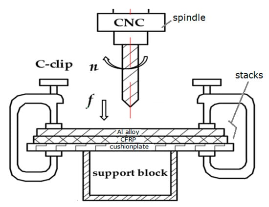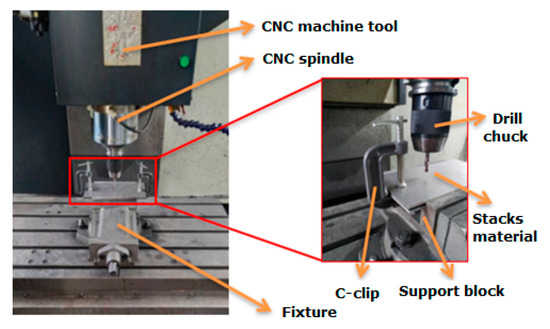 The hole manufacturing device is shown in Figure 2. The CNC machine tool (VMC850E, Shenyang Machine Tool Co., Ltd., Shenyang, China) was used to make holes in the CFRP and aluminum alloy stack material. Fixture clamps and positions of the stack material and the support block are also shown. The composite material is prone to burr, delamination, or tearing and other defects on the exit side. Thus, in the experimental scheme plans, a cushion plate with 3 mm thickness was used at the bottom of the composites to reduce the defects of holes. In addition, a program was used to control the spindle rotation speed of the CNC machine and make it a downward feed motion, which reduced the effect on the quality of holes.