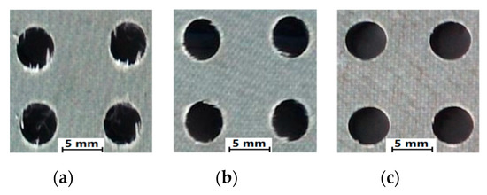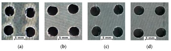 In order to improve manufacturing quality of holes, cushion plates with 3 mm thickness made of pine, Al5051 sheet, and acrylonitrile butadiene styrene(ABS) plastic plate were selected for pre-experiments based on the previous experimental results. After that, the hole quality was compared. The experimental results are shown in Figure 4. It can be found that the ABS plastic cushion plate had the best effect on hole-making. Thus, the ABS plastic cushion plate with 3 mm thickness was used for all holes in further experimental studies with the CFRP at the bottom of the stacks.