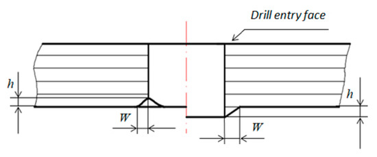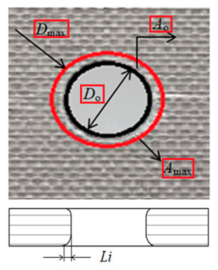 It was found that the edge damage of each hole was caused by delamination, tearing, slagging, etc. The quality evaluation criteria of manufacturing holes mainly referred to the requirements of an aviation company. A schematic diagram of the defect area at the edge of the hole is shown in Figure 5. If the degree of defect is within the range shown in Table 2, it is qualified and no further processing is required.