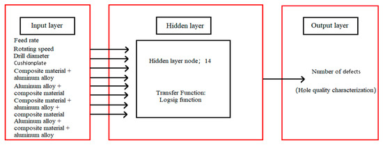In this paper, the hole-making schematic was as shown in Figure 1. In order to ensure that there was no gap between the cushion plate and stacks, the C-clip was used to fasten the cushion plate and stacks. Similarly, in order to enable the stack material to withstand the sufficient drilling forces, a support block was placed underneath it. The box-type support block supports the surroundings of the stack material. The stacks were composed of 7050-T7 Al alloy with a thickness of 2 mm and T300 CFRP with a thickness of 3 mm. Then, a model with a of 8–14–1 three-layer topology was designed using the BP neural network algorithm. By means of learning, training, prediction, and verification, the quality on manufacturing holes could be predicted, and the final optimized hole-making process was verified.