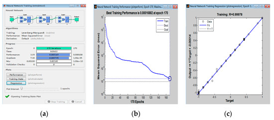 - According to the BP neural network prediction model with 8–14–1 three-layer topology, which underwent error correction of 170 steps, the error was reduced to 0.00016882, the regression fit was 0.99978, and the magnitude of training sample fitting error was about 10−2–10−5.