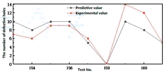 As shown in Figure 9, the prediction curve of the number of defective holes was similar to the trend of the experimental curve, but the prediction errors of samples No. 159 and No. 160 were larger.