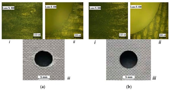 Surface topography of CFRP samples: (a) sample No. 155; (b) sample No. 158. i—interior surface morphology; ii—edge morphology; iii—exit appearance.