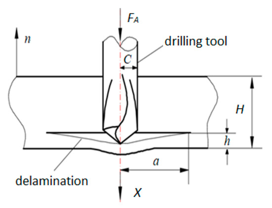 As shown in Figure 11, a drill bit with a radius C applies a load to the center of the circular plate. FA denotes the thrust, X denotes the displacement, H is the thickness, h is the thickness of the uncut layer under the tool, and a is the radius of the delamination range. Assuming that the composite laminate of each layer is isotropic, Equation (1) can be obtained according to the linear elastic fracture mechanics and the law of conservation of energy [19].