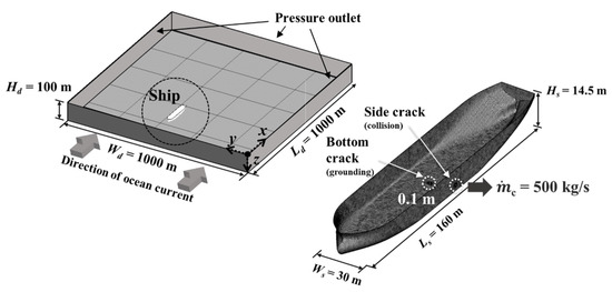 Among various HNSs, the present study used a styrene material for the simulation based on knowledge of detailed scenarios with various current–velocity conditions. Figure 1 shows the schematic of the model that represents the current-velocity profile. It is known that the current-velocity profile consists of a tide-induced current, a density-driven current, and a wind-driven current [17,18]. Because of the complexity of atmospheric conditions, we modeled the current-velocity profile in terms of the surface current velocity (vs), deep current velocity (vd), and depth of surface layer (ds). The present study considered four parameters, as follows: i) the surface velocity (vs), ii) the ratio of the deep current velocity to surface current velocity (vd/vs), iii) the depth of the surface layer (ds), and iv) the crack positions as the side (collision) and bottom (grounding). The surface velocity was set in the range from 0.1 to 1 m/s, and the deep current velocity was taken to be 30% to 100% of the surface current velocity (vs). Furthermore, the depth of the surface layer was in the range of 10 to 100 m. The simulation conditions were finally set for 80 cases. The present simulation ignored the interfacial waves between the seawater and air for simplicity because it would have required tremendous computational resources and complicated data about atmospheric conditions. Hence, the slip condition at sea level was taken as the boundary condition. Furthermore, the pressure out condition was used for all surfaces except for the bottom surface, upon which the wall boundary condition was applied. The density, viscosity, and diffusivity properties of styrene were set to 906 (kg/m3), 0.76 × 10−3 (kg/(m∙s)) and 2.0 × 10−9 (m2/s), respectively. It was also important to establish the accident scenario. This simulation was conducted under the scenarios considering two cracks from the side (collision) and bottom (grounding) [19,20]. Based on information provided by KRISO (Korea Research Institute of Ships & Ocean Engineering), a mass flow rate from a crack was set as 500 kg/s. With a time step of 0.05 s, the transient simulation was performed for a total simulation time of 1000 s. The corresponding averaged Courant number was estimated to be 0.1231, and the maximum Courant number of 0.9232 was found near the crack position. The estimated y+ values were in the range of 100 to 220, showing an acceptable range for predicting turbulent stresses appropriately.