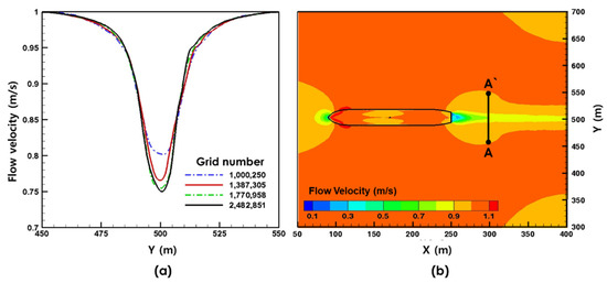 As shown in Figure 2, the computational domain had a size of 1000 m × 1000 m × 100 m. The detailed configuration of the ship was provided by KRISO. The accident ship had a length of 160 m, a width of 30 m, and a draft of 14.5 m. The crack with its area of 0.25 m2 was positioned at 80 m from the front of the ship. Furthermore, another scenario considered a side crack that could form owing to collision-induced damage. The side-crack was located at 10 m below sea level, and the bottom crack due to grounding was located at the center of the bottom surface of the ship. We used the tetrahedral grid system and built much finer grids around the ship, as shown in Figure 2b. For the grid convergence test, we compared the velocity profile behind the ship (x = 290, z = 0, 450 m < y < 550 m) in the case of vs = 1, vd/vs = 0.5, and ds = 30 m. As shown Figure 3a, the maximum deviation between grid numbers of 1,770,958 and 2,482,851 was estimated to be 0.7% at y = 500 m. Therefore, the present study adopted 1,770,958 elements and 322,925 nodes after the grid convergence tests. We set the convergence criterion for the continuity as 10−4, for the energy as 10−6, and for others as 10−3.