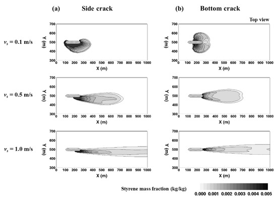 Figure 4a,b presents the predicted propagation behavior of styrene with different current velocities at a flow time 1000 s after leaking began. As expected, the surface current velocity (vs) substantially affects the diffusive characteristics of styrene propagation. As the surface current velocity increased, styrene propagated much faster owing to the advection effect, whereas the styrene propagation was barely affected by the crack positions. The latter was because styrene, as a floating material, rapidly moved upward after being spilled from the crack, indicating the propagation behaviors at the side and bottom cracks were almost the same. Unlike the bottom crack, the styrene distribution in the side crack case showed a slightly asymmetric shape. After considering three factors, namely the surface current velocity, deep current velocity, and surface layer depth, it was found that the surface current velocity significantly affected the propagation behavior after a styrene spill.