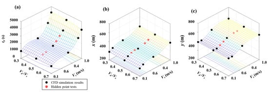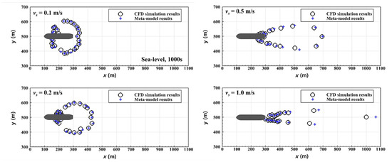 Figure 6 shows the predicted styrene interface location at t = 1000 s according to the surface current velocity, which was predicted using the present metamodel in the bottom crack case with vd/vs = 0.5 and ds = 30 m. The blue dot represents the styrene interface. It shows that at a low surface current velocity, the diffusion effect became dominant, and the styrene interface had an almost circular shape. As the surface current velocity increased, the shape of the styrene interface was closer to an ellipse due to the large advection effect. The goodness of fit was evaluated using R2 and RMSE (root mean square error). As listed in Table 1, the R2 values were greater than 0.9, which means that the metamodel provided a good fit.