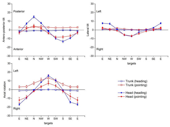 Variation of the head orientation by reference to the trunk as a function of target direction. The graphs represent the Euler angles (anterior/posterior tilt, lateral tilt and axial rotation) describing the orientation of the head relative to the trunk at the time of heading (blue circles) and pointing (pink circles). Each point represents the mean ± SEM of 10 participants.