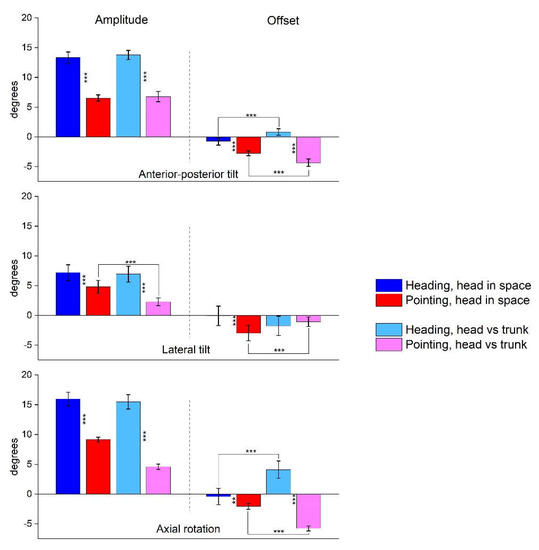 Variation of the parameters of the sinusoidal fitting. The graphs show the amplitude and offset of the sinusoidal fitting of the Euler angles as a function of target direction. Each histogram represents the mean ± SEM of 10 participants. Asterisks indicate statistical significance calculated by the fitting procedure (Origin Software, Levenberg Marquardt algorithm). Black asterisks vertically oriented compare tasks (pointing vs heading) and asterisks horizontally oriented compare reference frames (head orientation by reference to trunk vs space) (***: p < 0.001, **: p < 0.01, *: p < 0.05).