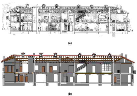 CAD (Computer-Aided Design) geometric survey obtained from a points cloud: (a) cloud resolution; (b) CAD re-drawing of the transversal section.