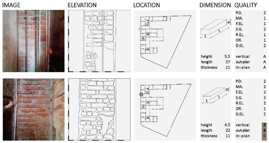 A rapid method of characterizing the masonry quality has been developed by Borri et al. [17,18,19,20]. Having at their disposal a rich catalogue of masonry typologies typical of Italian regions [21,22] (https://www.abacomurature.it/), the authors have developed a methodology that, on the basis of a sample visual survey of the masonry surface, can provide an index of masonry quality. This classifies masonry into three categories against its possible response to vertical or horizontal—in plane or out of plane—forces: good (A), medium (B), very bad (C) (Table 1 and Figure 2).
