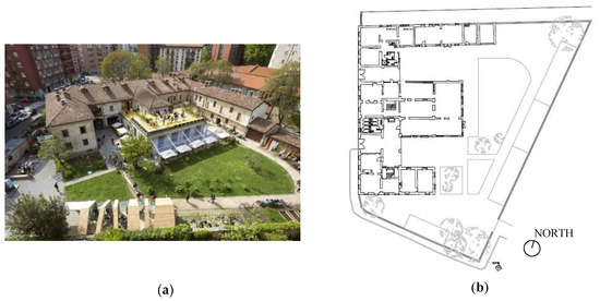 Cascina Cuccagna, (a) overall view and (b) ground floor plan.