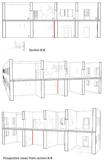 The survey on the masonry quality has shown masonry with variable quality, depending above all on the time of construction (Figure 4). In this case, the calculation of a safety factor SF (%) (Equation (2)) is not required, but we can assume that: for class A masonry, SF can be considered greater than 80% of the value required by law; for class B masonry, it can be considered in the range of 50%–75%; while for class C masonry, it can be considered between 25% and 50% of the value required by law. The walls tested, except for a couple of cases, show a medium/high behavior to the transmission of vertical loads, and some criticalities for the transmission of out of plane loads on the most deteriorated panels.