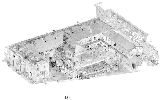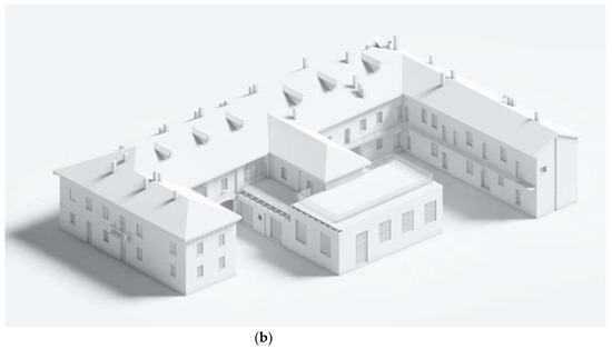 Reconstruction of the parametric 3D model and photorealistic representation of the white-model render: (a) point cloud, (b) re-drawing.