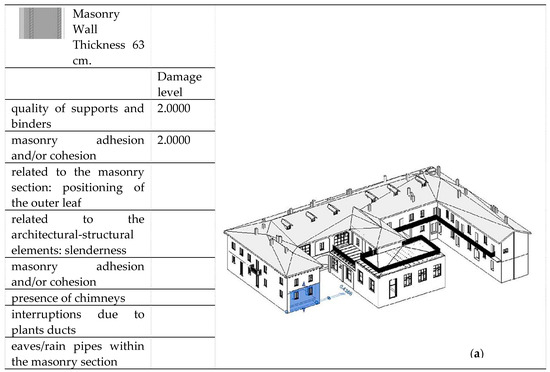From the rapid evaluations and the experimental tests carried out, each vertical and horizontal structural element and all the non-structural elements could be classified as indicated in Table 4. Each type of specific vulnerability found on individual elements was assigned a weight, according to the damage level obtained in the previous investigations: absent damage (0), scarcely influential (1), averagely influential (2), significantly influential (3). The result of this operation is presented in a matrix with a correspondence between structural elements and specific vulnerabilities, useful to characterize the elements in a BIM environment. In the commercial software that was used, in addition to the geometric, mechanical, and material characteristics, each structural element could be associated with the table of specific vulnerabilities and weights assigned to each item referred to that element. (Figure 9).