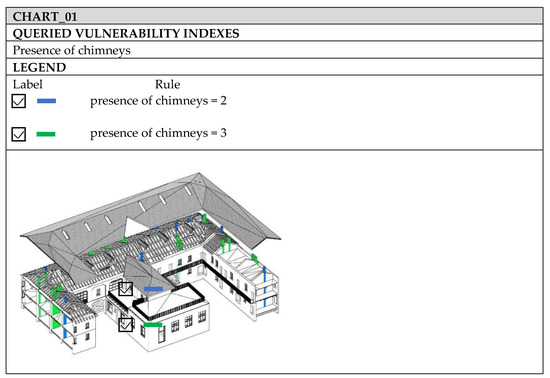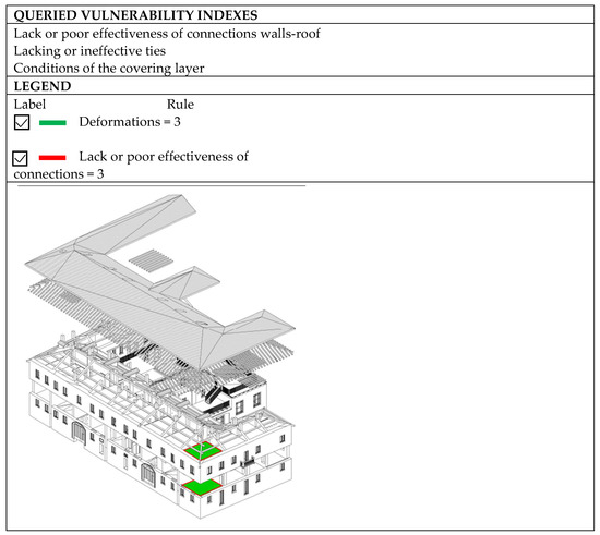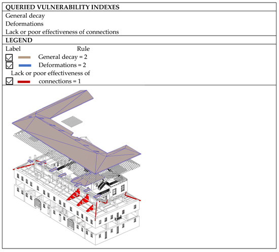 Different types of queries can be performed. The system can be queried about the presence of a certain type of specific vulnerability throughout the building and its degree of incidence on a given element or on the overall vulnerability of the system (Figure 10). The presence of two or more specific vulnerabilities with different degrees of incidence on the overall vulnerability can also be visualized (Figure 10 and Figure 11).