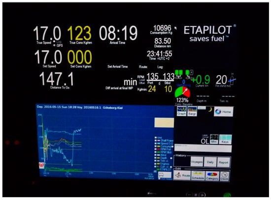 To explore the practical energy-saving issues in the use of advanced technologies, the authors of this paper planned an ethnographic study and visited the ferry ships owned by a collaborating ferry company. The company introduced a commercial fuel consumption monitoring system called ETA-pilot to assist the navigators to regulate the speed automatically, as speed is directly related to fuel consumption. Voyages had been divided into multiple legs with fixed positions (waypoints). The ETA-pilot proposed an optimal speed setting for each leg of the journey, based on multiple factors (e.g., ship trim/draft, depth of the water, weather information, distance to the destination and estimated time of arrival, etc.). The speed can also be adjusted by the navigators as course and speed deviations may be required to follow collision avoidance regulations. The fuel consumption (per nautical mile) is displayed as a dynamic curve along with other output parameters in a complex line chart at the bottom of the user interface, while the total consumption is displayed on the top right corner (see Figure 2).