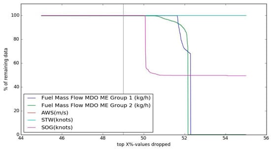 Figure 4 depicts the relationship between the top x%-values dropped and the corresponding amount of the remaining data points (i.e., the data that do not fall into the cut-off segment).