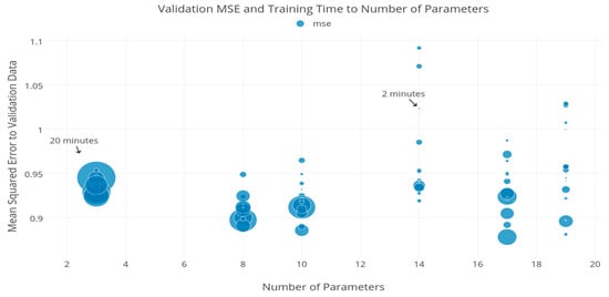 Validation mean-squared error (MSE) and training time of MLP models with depending on the number of parameters.