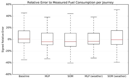 Figure 8 shows the relative error to the validation data for different choices of input parameters. This relative error is the average over all model runs with the described input parameters (varying network size, batch size, etc.). The selection of some parameters depended on the inclusion of other parameters, because they are connected semantically (e.g., wind speed and wind direction). It is clearly visible in Figure 8 that too many input parameters led to models that were not trainable. Given the amount of data captured (1 or 2 years per ship), the number of trainable weights is too high for the MLP to converge.