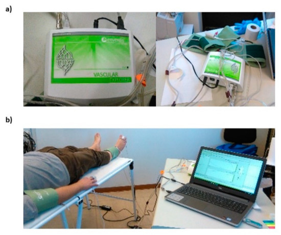 The standard procedure to measure ABI employing the Enverdis Vascular Explorer device (VE, Figure 1a) was performed. The participants were requested to lay in the supine position, and the cuffs were placed over the brachial artery and immediately proximal to the malleoli. The optical probes, provided by VE, were placed on the index finger of the hand and on the second finger of the foot (Figure 1b). The sensors and the cuffs were located on the left side and then on the right side of each participant.