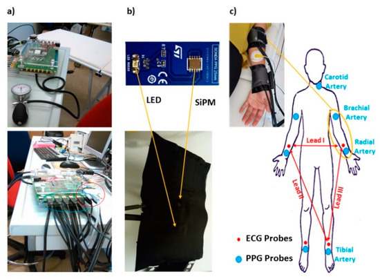A total of 7 available probes were placed on the left carotid artery, on the brachial arteries, on the radial arteries and immediately proximal to the malleoli investigating the tibial arteries. The elevated number of probes allowed to simultaneously perform the measurements on the two body sides (right and left). The system also permitted to synchronously acquire ECG (Lead I, Lead II and Lead III; Figure 2c) [39] at the same sample frequency of 1 kHz. The locations of PPG probes and ECG electrodes is reported in Figure 2c.