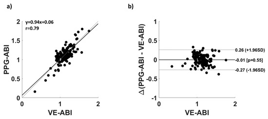 Paired t-test [44] assessed the presence of a bias in the PPG-ABI estimation with respect to VE-ABI, and the correlation [45] characterized the relationship between the two variables.