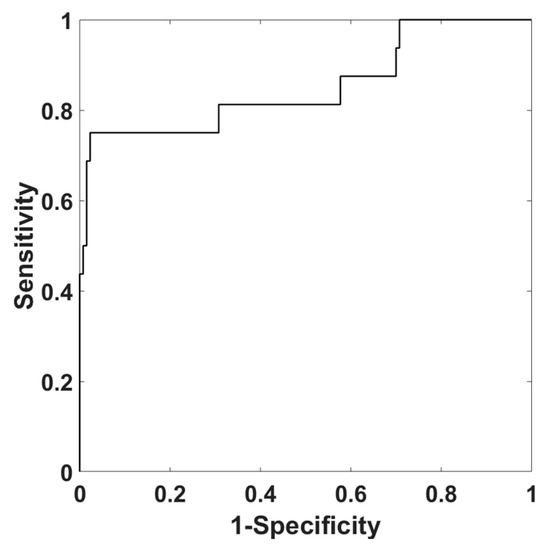 The AUC retrieved with a multivariate approach (AUC = 0.85) was significantly different [49] from the AUCs obtained employing univariate analysis from standalone PPG features (vs. AUC = 0.46, z = 4.80, p = ~0 for MaxArm; vs. AUC = 0.51, z = 4.12, p = 3.8 × 10−5 for MaxAnkle; vs. AUC = 0.32, z = 7.12, p = ~0 for SlopeArm; vs. AUC = 0.37, z = 6.21, p = ~0 for SlopeAnkle; vs. AUC = 0.36, z = 6.38, p = ~0 for TDArm; vs. AUC = 0.35, z = 6.56, p = ~0 for TDAnkle; vs. AUC = 0.52, z = 3.99, p = 6.7 × 10−5 for Ankle-Arm).