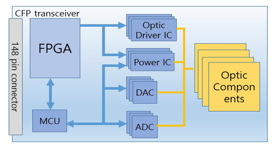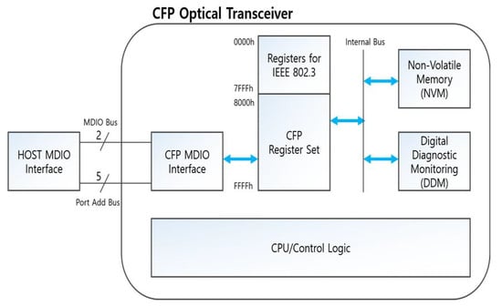 C form-factor pluggable (CFP) optical transceivers are among the types of optical transceiver used for long-distance data transmission over 100 Gbps. The CFP multi-source agreement (MSA) standard is the industry standard for physical/electrical specifications, control and management practices for quality assurance, and cost savings of CFP manufacturers [11,12]. The CFP firmware enables communication between the CFP and external host controller communicates the CFP transceiver status through this communication interface, and receives control commands for the CFP transceiver operation. CFP firmware is also responsible for monitoring and controlling the state of the CFP transceiver by configuring the memory and updating the information according to the standard.