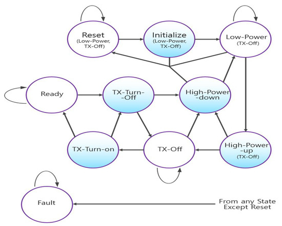 Initially, the CFP transceiver starts in a reset state, in which all circuits remain in low power mode, and transitions to the next initialization state. In this case, communication with the external host controller is disconnected and the NVR data are loaded for initial VR operation. If failure occurs, the transceiver enters a fault state or low power state. In the low power state, the CFP transceiver confirms that the MDIO interface and control circuit are ready for normal operation and enters a high power up state according to CFP state memory value and control signal. At this time, all circuits can be normally operated and stabilized, and then the tx-off state is entered. The tx-off state is the state in which the power of the optical transmitter using the network channel is not supplied. From here, the CFP transceiver can enter the tx-turn on state, in which the transceiver determines whether to use the channel according to the settings in the register. After that, the CFP transceiver finally transitions to the ready state and data are transmitted. Depending on the host request, the CFP may be in low power mode or perform a reboot. In the case of a low power mode request, it switches to the tx-off state, closes all channels, enters the high power down state, and then enters the low power state. Here, the CFP should power down all the circuitry to less than 2 Watts and keep only the MDIO interface function running. Finally, the fault state must remain in low-power mode to prevent permanent damage to the CFP, and the MDIO interface and DDM functions must be operating normal for recovery.