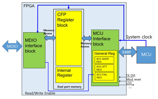 Figure 5 shows an internal functional block diagram of the FPGA. All clock sources for FPGA operation come from the MCU. The clock speed is set to 48 MHz. The driving clock is used for the MDIO interface in the FPGA that communicates with the host, the communication between the FPGA and MCU, and information transfer between the FPGA internal blocks. The MDIO interface of the FPGA is implemented to operate as an MDIO slave. It is designed to enable data access (write/read) functions according to physical addresses set by the host.
