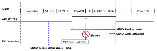 The ACC_STT_REG(access status register) signal can be found through FPGA register 0 × 10061. The MCU verifies that the status of the ACC_STT_REG signal is IDLE and then performs a write operation. When the memory write operation of the MCU is performed, the ACC_STT_REG signal is enabled after the access is recognized by the MDIO frame. Since the ACC_STT_REG signal is enabled, the write operation is blocked in the FPGA. The WR_FAIL bit at 0 × 10062 is activated. However, read operation of the MCU is allowed.