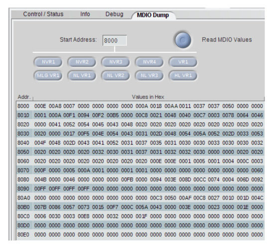 Figure 11 shows the values read from the FPGA-based CFP memory map. The addresses range from 0 × 8000 to 0 × 80FF. This result shows that the MDIO interface within the FPGA block worked normally in slave mode. Moreover, the MDIO writing function of ONT equipment confirmed that the desired value could be successfully written to the CFP standard memory.