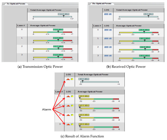 Figure 12a,b show the transmitted and received optical power values, respectively, which are within an acceptable error range (+/−2 dB). This is the result output by the DDM function proposed in Section 3. In addition, we confirmed that the temperature, CFP transceiver voltage, and DDM values of the optical components characteristics were monitored normally. Figure 12c shows the results of blocking the optical input of the receiver to check whether the alarm was displayed according to the requirements of the standard. The received optical power was found to be −40 dBm, and the loss of signal was displayed accordingly. We also confirmed that GLB_ALRM was operating normally following the implementation of the FAWS mechanism in Section 2.