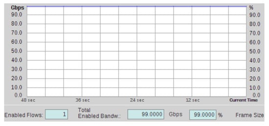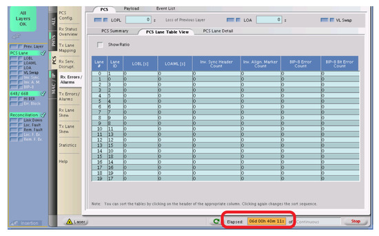Figure 13 shows the results for the data throughput through the CFP test bed. The CFP transceiver was loaded to transmit and receive 99% of the available bandwidth. The test results confirmed that the data were transmitted and received without error at a utilization of more than 99%. Figure 14 shows the results of a long-term test for the safety and reliability of optical transceivers produced by the proposed firmware technique. It was verified that the operation was stable for more than 144 h without errors.
