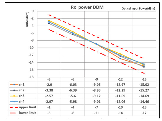 To verify the performance of the DDM function, we measured the received optical power DDM of the CFP transceiver for each channel. By adjusting the optical power input into the CFP transceiver using a variable attenuator, the received optical power DDM accuracy was measured over several sections. Figure 15 shows the received optical power DDM value of each channel measured for input optical powers ranging from −3 dBm to −15 dBm. All channels are within the margin of error, and channel 4 has the highest accuracy of 93.4%. By section, the accuracy is the highest when the optical power of −9 dBm is received. The accuracy trend varies depending on the characteristics of the optical component.