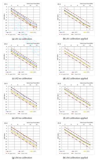 Figure 16 shows a measurement graph of the received optical power DDM before (a,c,e,g) and after (b,d,f,h) the temperature calibration at high temperature and low temperature. The measurement indicates that the DDM value is reading lower and lower as the temperature goes from low to high. Therefore, the accuracy of DDM becomes lower when it is in low temperature and high temperature environment. For channels 3 and 4, the low temperature DDM value before temperature calibration is close at the upper limit of the error range. However, the graphs of the results of applying the temperature calibration method proposed in this paper all have sufficient margins in the margin of error. This result is show that the application of the temperature calibration method proposed in this paper can maintain high DDM accuracy even in the change of optical component properties with temperature.